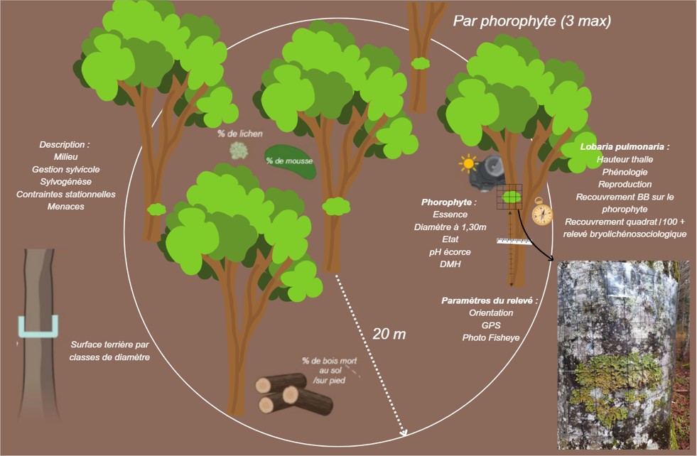 L’élaboration du protocole d’étude du Lichen pulmonaire a nécessité la constitution d’un groupe de travail. Le protocole retenu contient des mesures descriptives, dendrologiques, bryo-lichéniques et de traits de vie.
