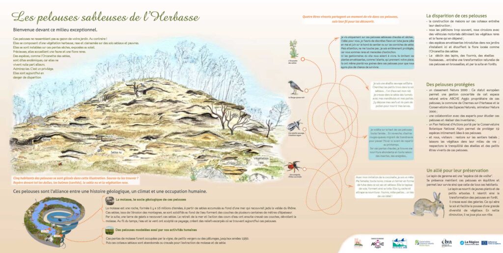 - Communutés de communes Arche Agglo, panneau informatif : A Charmes sur l’Herbasse, dans la Drôme, venez découvrir un site exceptionnel et une espèce endémique : l’Orcanette des sables
