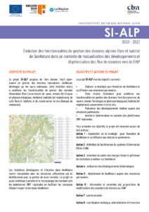 Le projet SI-ALP propose de faire évoluer l’outil open-source de gestion des données naturalistes GeoNature, développé par les parcs nationaux. Cette évolution visera à améliorer les fonctionnalités de gestion des données d’inventaire flore (occurrences de taxon, relevés floristiques et phytosociologiques, herbiers), habitats (et végétations), de suivi flore et habitats et de conservation ex-situ (banque de semences). Les évolutions développées et intégrées dans GeoNature seront mutualisées avec les structures utilisatrices qui en bénéficieront pour la gestion de leurs données. Le projet va aussi contribuer à améliorer le moissonnage des données vers les plateformes SINP régionales en facilitant les processus d’import/export entre bases GeoNature.